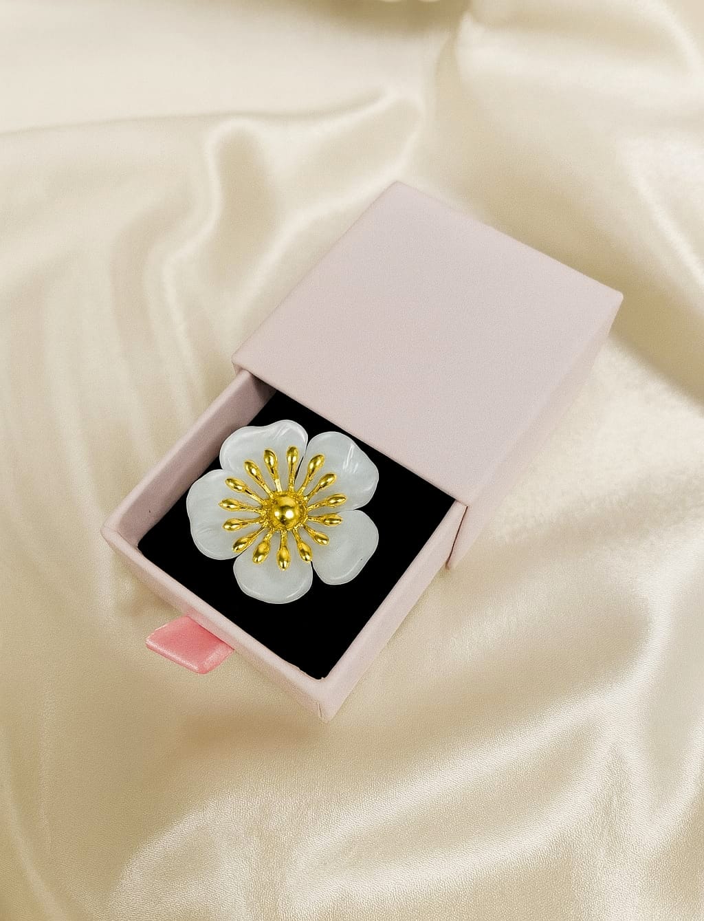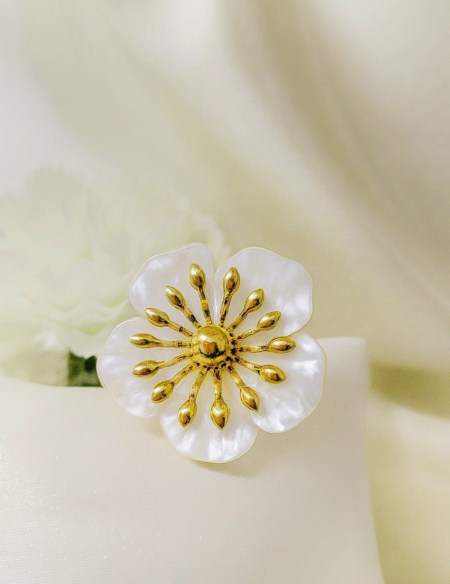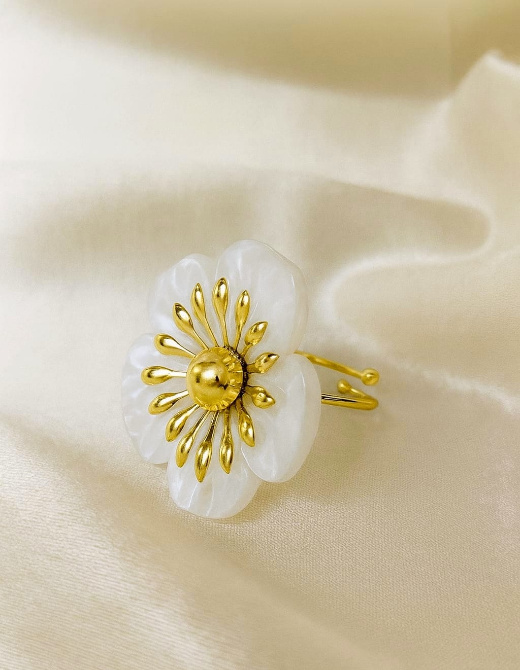 Un anillo de flor de nácar simboliza la pureza, la belleza y la armonía, a menudo representando la feminidad y la calma emocional. La flor añade el significado de crecimiento, amor y conexión emocional, mientras que el nácar aporta una energía protectora, de renovación y de equilibrio emocional.