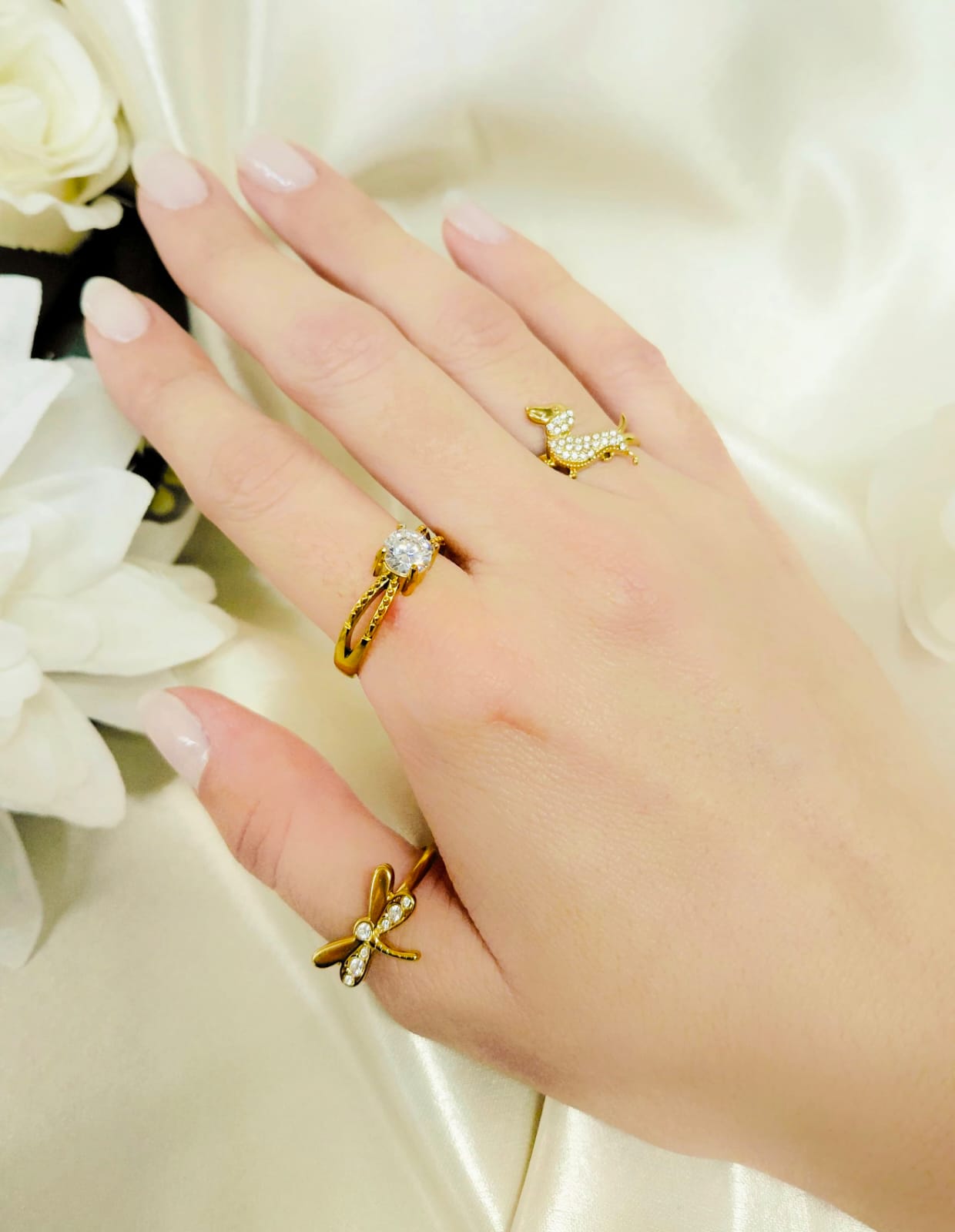 Un anillo de libélula con circonita simboliza transformación, cambio, adaptabilidad, crecimiento y buena suerte. La libélula representa la sabiduría, la evolución personal y la capacidad de adaptarse a las circunstancias. La circonita, por su parte, añade brillo y belleza a la pieza, y puede representar la pureza, la luz y el éxito.