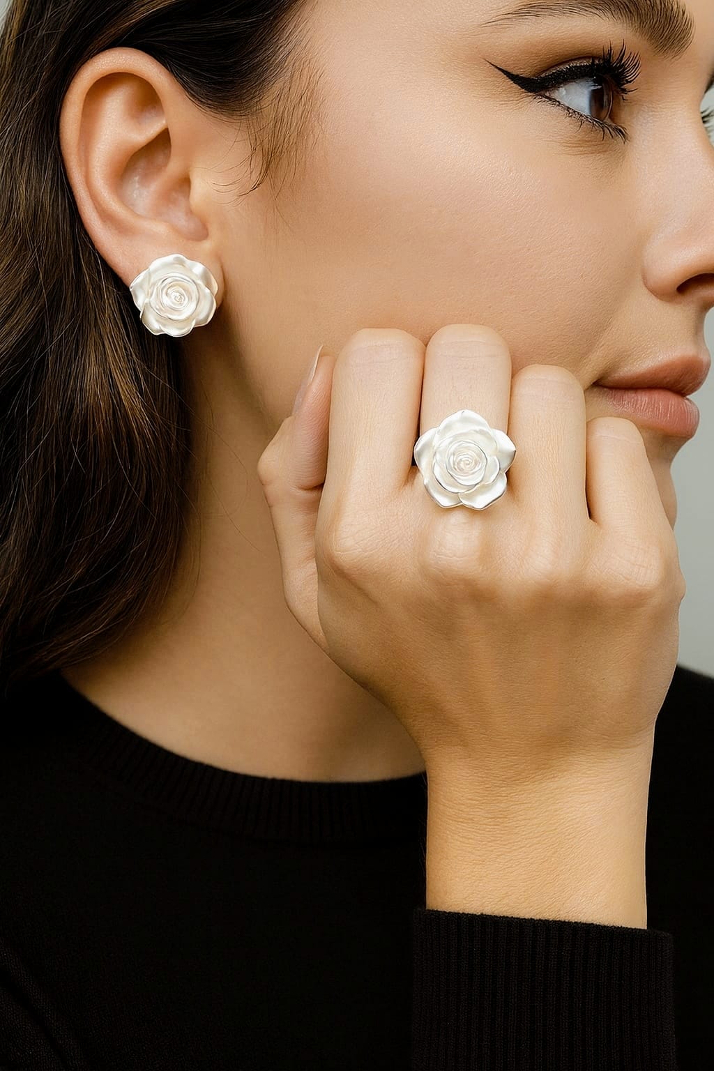 Un anillo de rosa blanca simbolizan la inocencia, la pureza y la lealtad, mientras que el oro blanco representa la elegancia moderna. Un pendientes de oro blanco con una rosa blanca combina la belleza delicada de la flor con la sofisticación del metal, ideal para quienes buscan expresar pureza, amor sincero y un estilo contemporáneo.