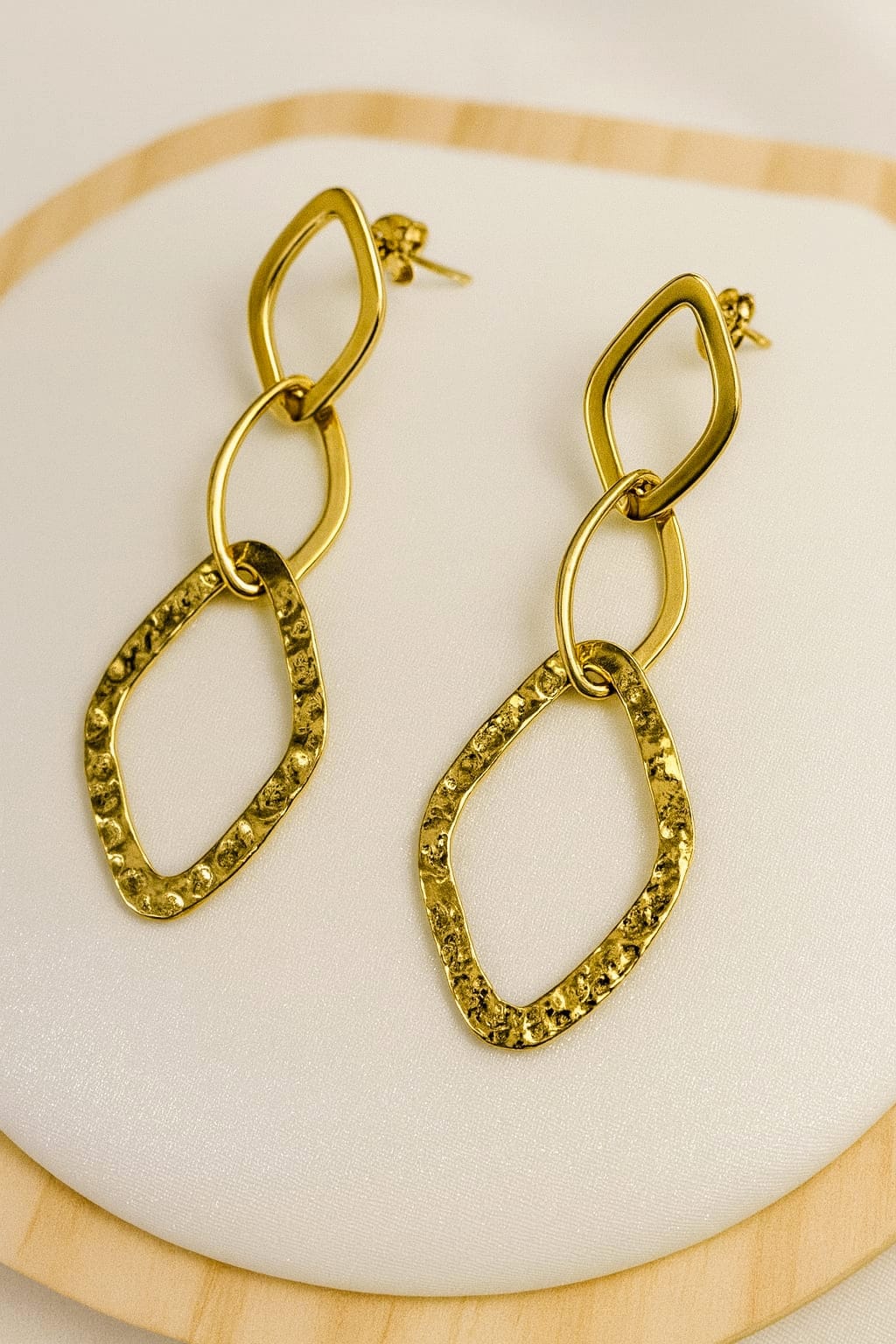 “Pendiente largo eslabón” se refiere a un tipo de pendiente largo que cuelga, compuesto por varias piezas enlazadas (eslabones) que se mueven. Este término describe un diseño de joyería elegante que puede ser muy sofisticado, aportando movimiento y prestancia a quien lo lleva. A diferencia de los pendientes de botón o pegados a la oreja, esta joya tiene una o más partes móviles que cuelgan de un elemento fijo en el lóbulo, como una cadena, por ejemplo.