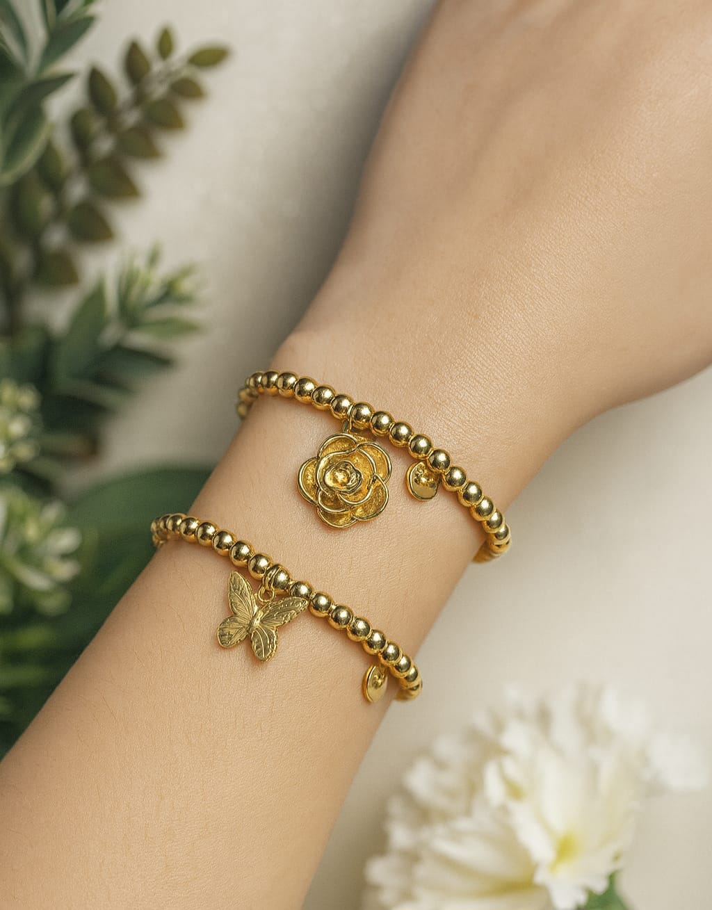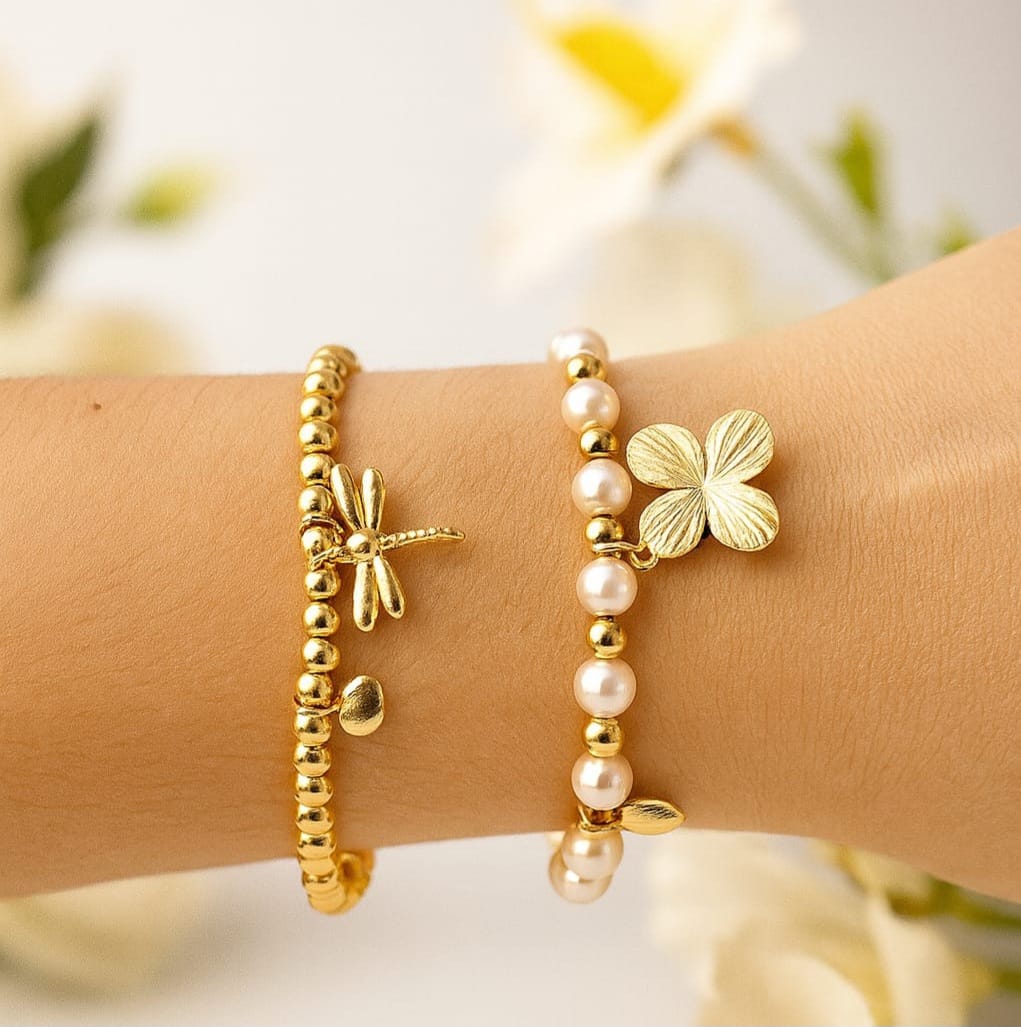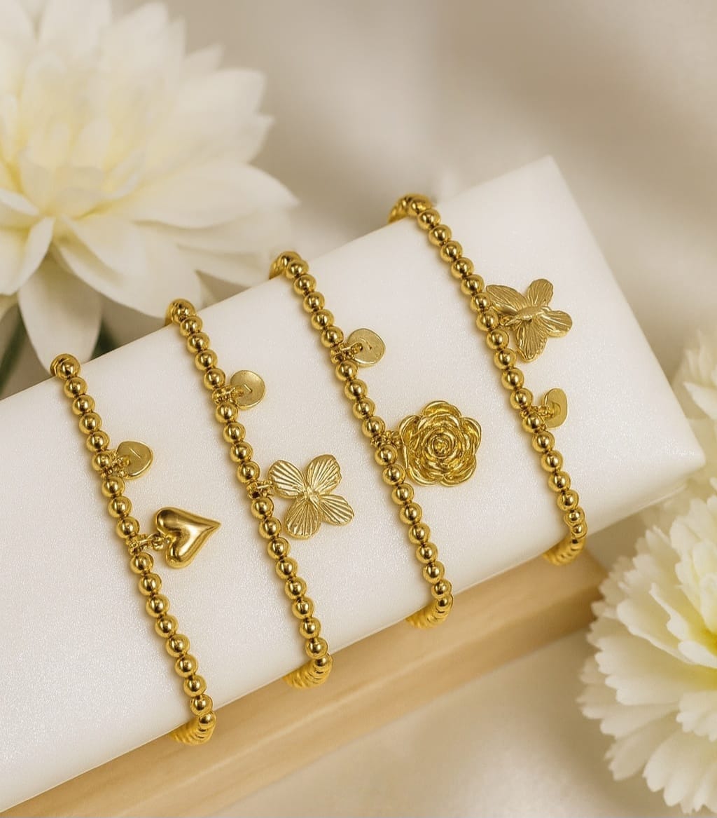 Una pulsera de cuentas doradas con un dije de flor, coral etc combina los significados del oro, las cuentas, simbolizando valor, durabilidad, armonía, dulzura, y búsqueda de equilibrio interior o espiritualidad. El oro representa un regalo de valor y afecto, simboliza energías positivas y la dulzura, mientras que las cuentas pueden evocar introspección y una conexión con lo espiritual.
