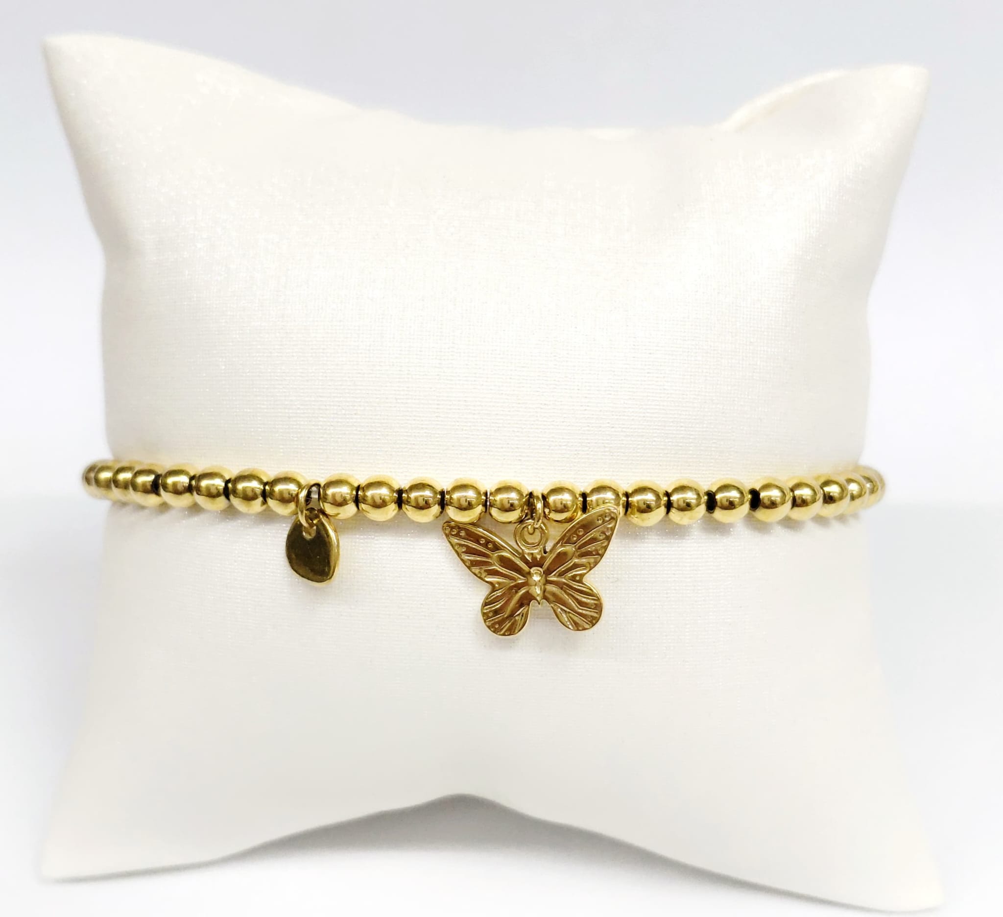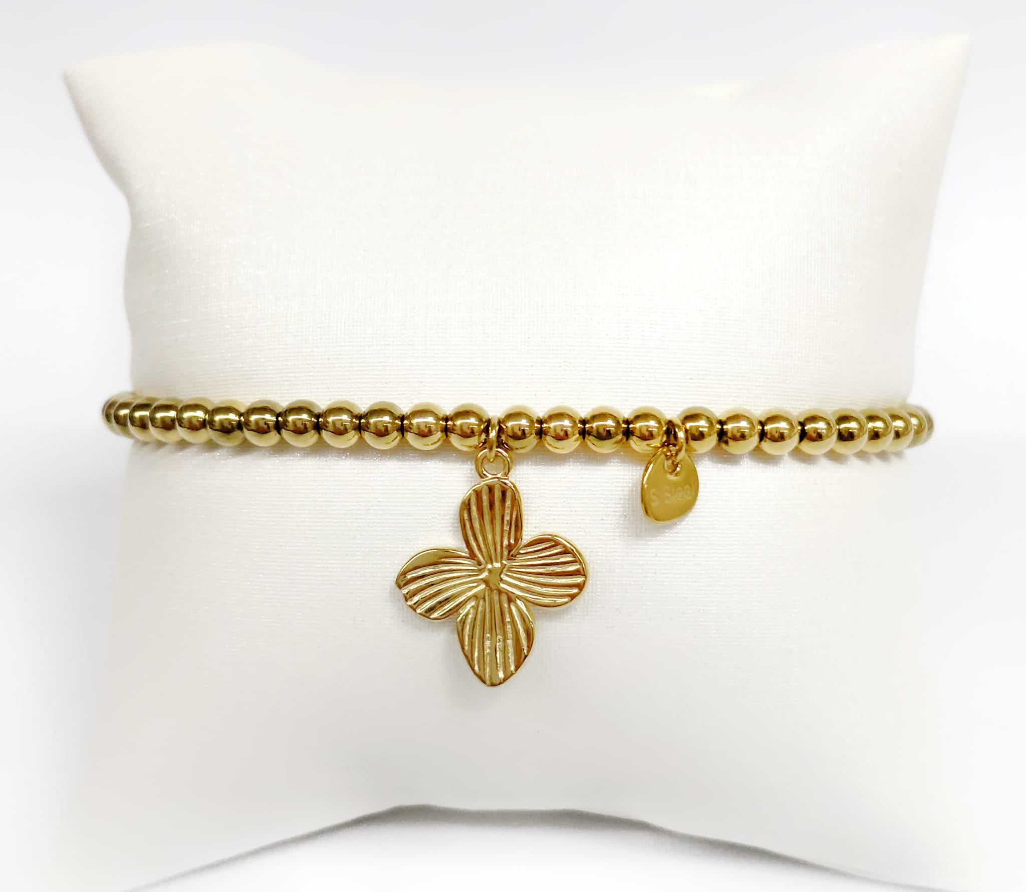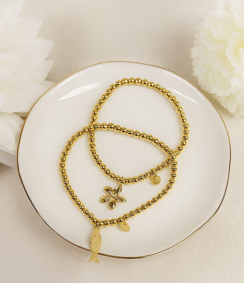 Una pulsera de cuentas doradas con un dije de flor, coral etc combina los significados del oro, las cuentas, simbolizando valor, durabilidad, armonía, dulzura, y búsqueda de equilibrio interior o espiritualidad. El oro representa un regalo de valor y afecto, simboliza energías positivas y la dulzura, mientras que las cuentas pueden evocar introspección y una conexión con lo espiritual.